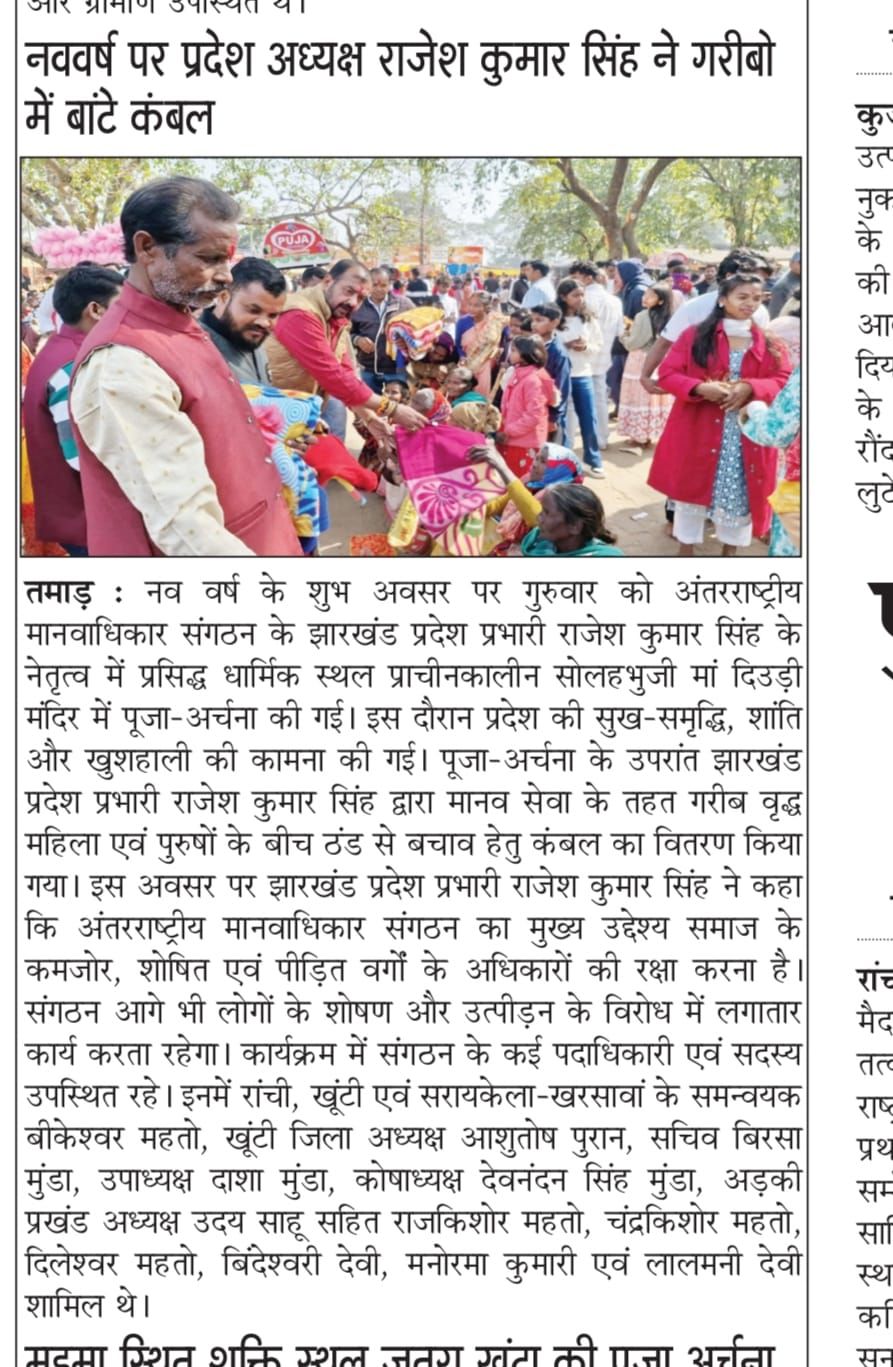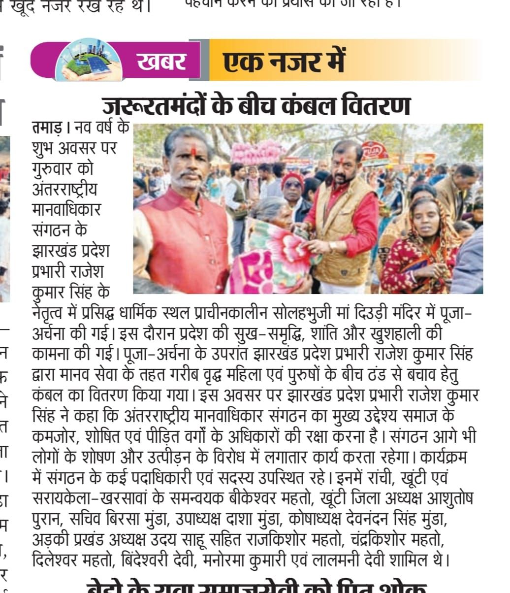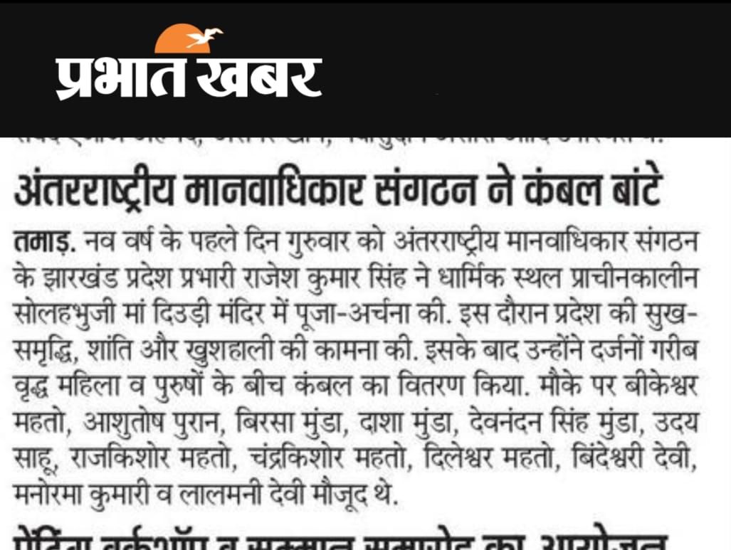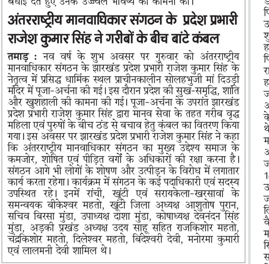 प्रेस विज्ञप्ति अंतरराष्ट्रीय मानवाधिकार संगठन का दो दिवसीय विधिक सहायता सह प्रसाद वितरण शिविर का आयोजन धुर्वा सेक्टर 2 के शालीमार बाजार में झारखंड के प्रदेश प्रभारी श्री राजेश कुमार सिंह के नेतृत्व में किया गया। इस अवसर पर अंतरराष्ट्रीय मानवाधिकार संगठन के द्वारा छठव्रतियों की सुविधा हेतु संगठन के कार्यकर्ताओं द्वारा प्रसाद वितरण भी किया गया एवं घाट पर आए हुए श्रद्धालुओं के बीच विधिक जागरूकता से संबंधित पंपलेट भी बांटा गया। इस मौके पर राष्ट्रीय अध्यक्ष रितेश कुमार ने